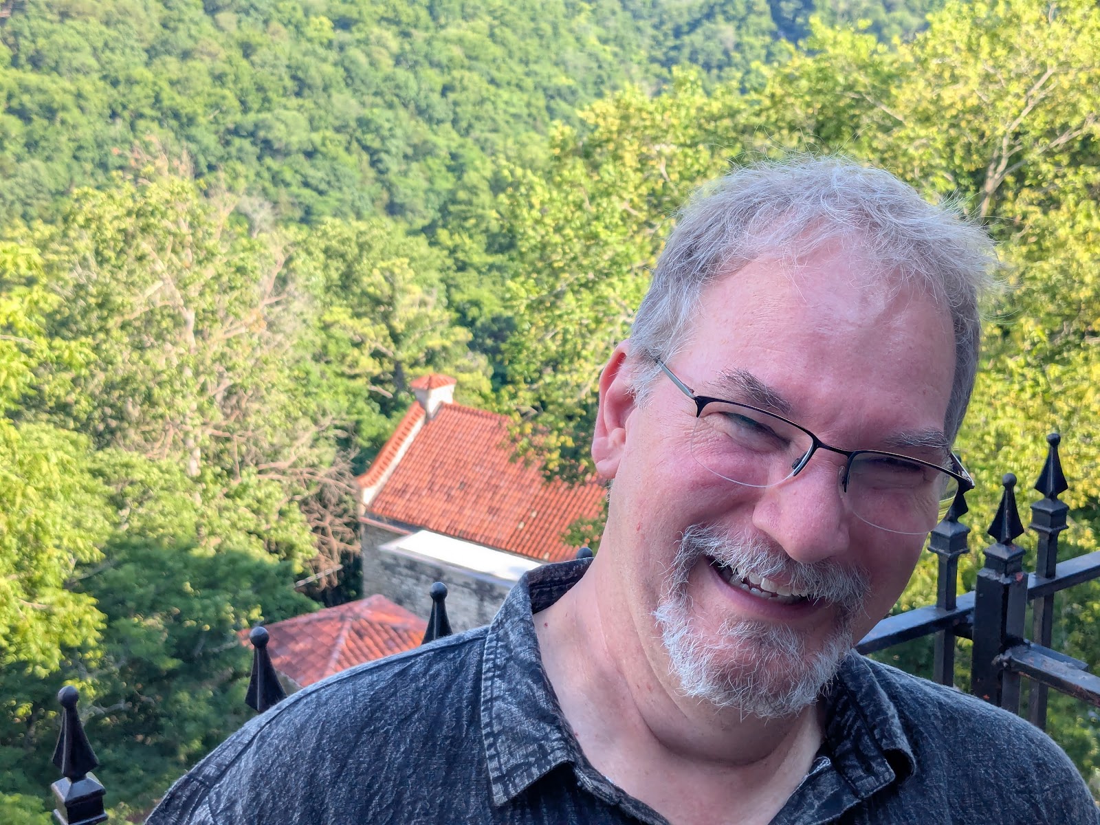 | Up on the balcony of the Crescent hotel after enjoying a simple pizza dinner. |